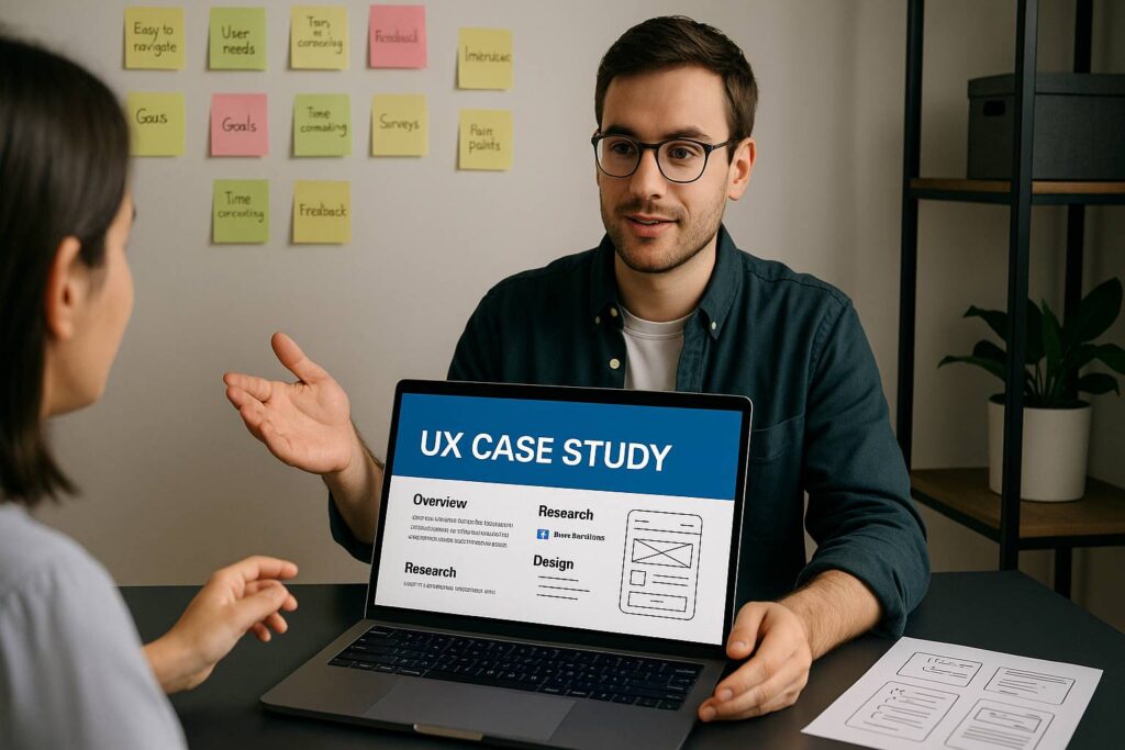 Anda juga belajar membuat case study, bukan sekadar screenshot desain. Ini krusial karena rekruter tidak hanya ingin melihat hasil akhir, tapi proses berpikir Anda.
