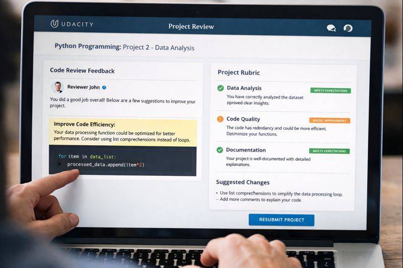 Setiap Nanodegree punya 5–8 proyek wajib yang harus lulus review manual. Reviewer bakal kasih feedback konkret: kode kurang efisien, UI/UX kurang intuitif, atau analisis datanya kurang dalam. Ini mini code review seperti di dunia kerja.